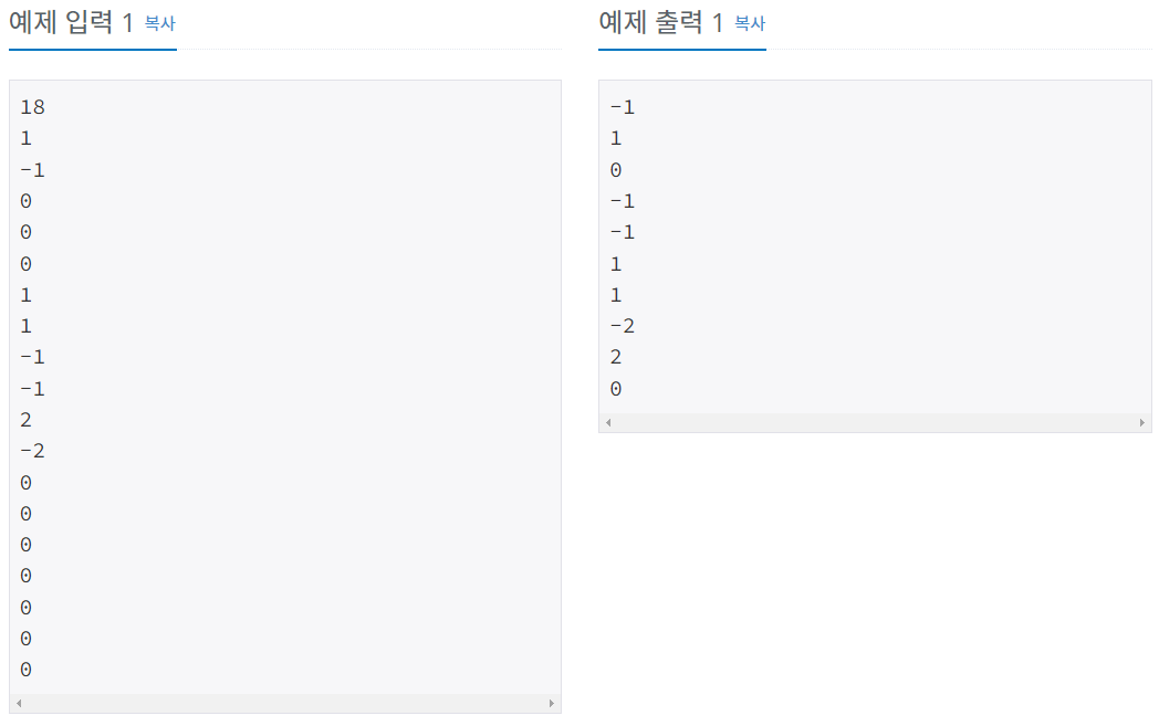 첫째 줄에 연산의 개수 N(1≤N≤100,000)이 주어진다. 다음 N개의 줄에는 연산에 대한 정보를 나타내는 정수 x가 주어진다. 만약 x가 0이 아니라면 배열에 x라는 값을 넣는(추가하는) 연산이고, x가 0이라면 배열에서 절댓값이 가장 작은 값을 출력하고 그 값을 배열에서 제거하는 경우이다. 입력되는 정수는 -231보다 크고, 231보다 작다.