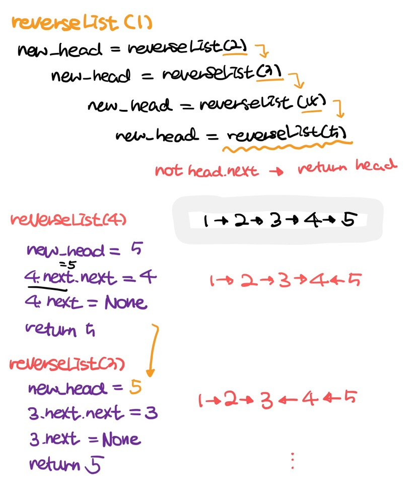 이후 reverseList(1)에서 동일한 과정을 거쳐 1<-2<-3 방향의 리스트가 완성된다.