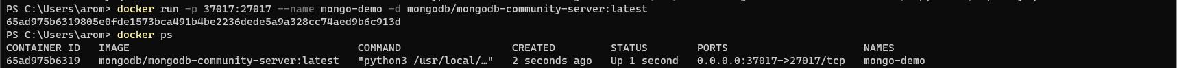 docker run -p 37017:27017 --name mongo-demo -d mongodb/mongodb-community-server:latest