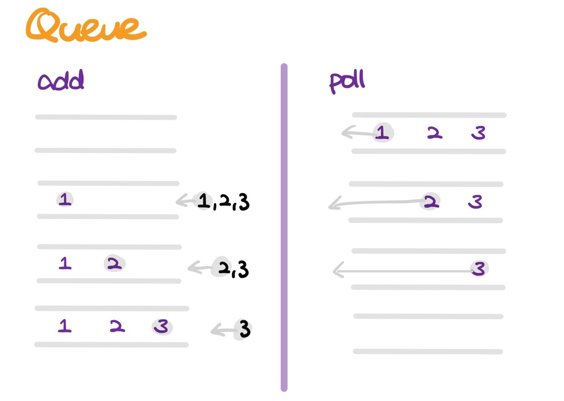그림과 같이 add 연산을 수행하면 자료가 한 줄로 한개씩 들어가게 되고 , poll 연산을 수행하면 맨 앞에 있는 요소만을 꺼내올 수 있다.