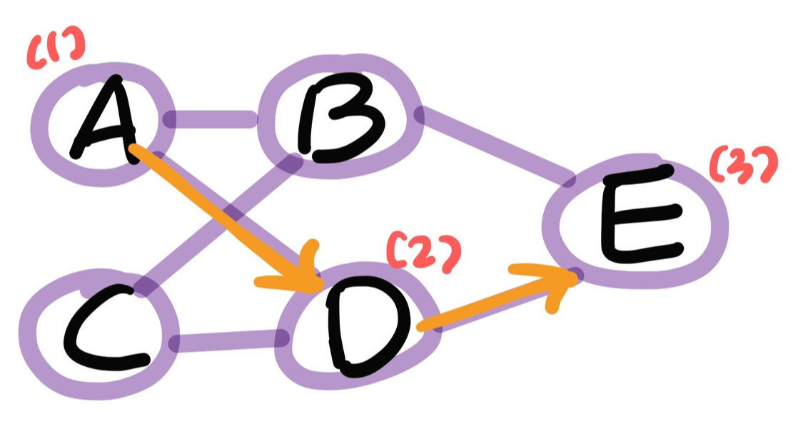 따라서 위와 같이 A, B, C, D, E 노드들을 잇는 간선이 존재한다고 할 때, A부터 시작해 E를 찾는 DFS 알고리즘은 다음과 같이 구현될 수 있다.
