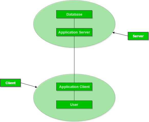ODBC, JDBC와 같은 API를 사용해 클라이언트가 데이터베이스 서버와 직접적으로 통신하는 구조이다. 하나의 서버와 다수의 클라이언트로 구성될 수 있으며 사용자가 클라이언트를 통해서 서버에 서비스를 요청하면, 서버는 클라이언트에게 서비스를 제공한다. 과정에서 서버는 계속 클라이언트로부터 요청을 대기하게 된다.