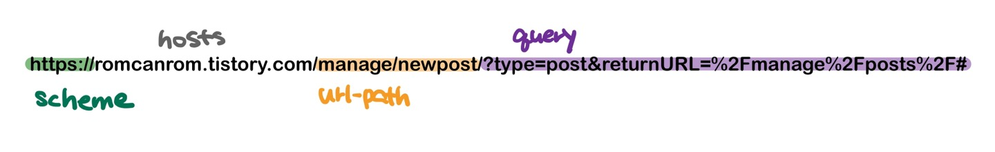 (일반적으로) URL의 구성요소인 scheme, host, url-path에 더해 query, bookmark를 포함한다.